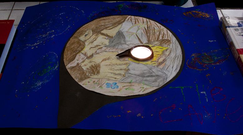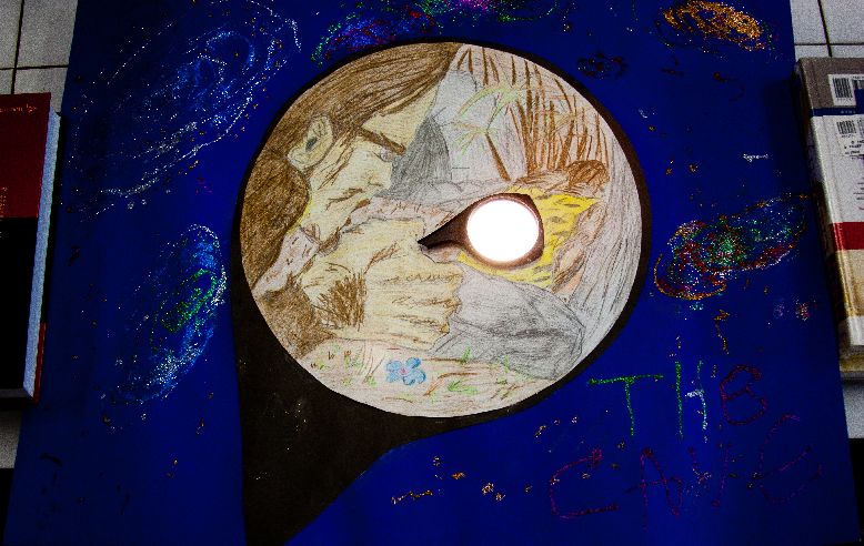 Moreover, I further emphasise the aforementioned Platonic message, in that the cavemen in my piece, are within another magnifying glass, on a larger bristol board covered in galaxies, which is meant to symbolically represent the unimaginable smallness of earth and humans in comparison with the rest of the universe. This also represents another sense-defying discovery in the 20th century: the vastness of the universe and the fact that even on this large scale there are areas of empty space.