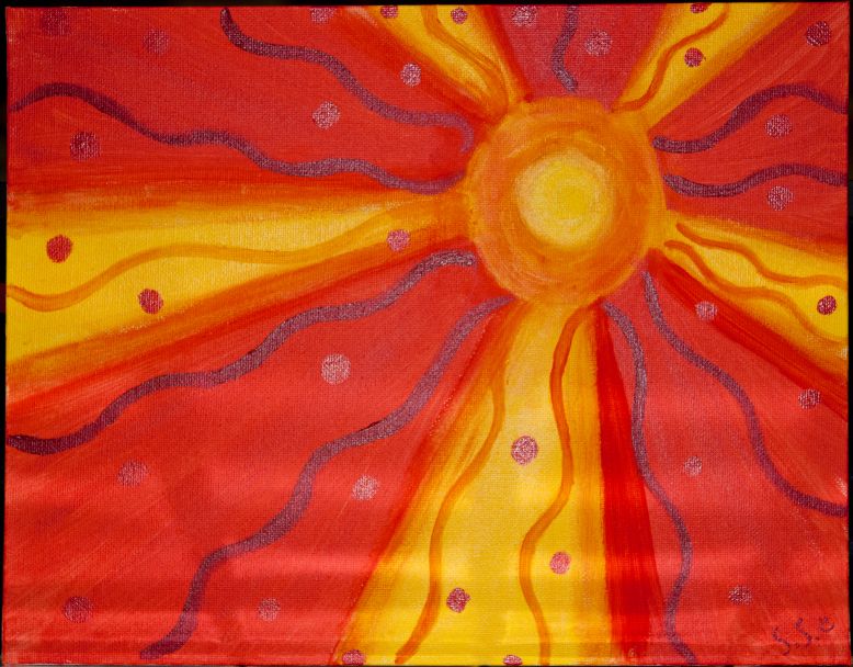 The painting portrays the rays of the sun. To show that that light could behave, either, as particles or as waves, I decided to paint waives and dots to represent the waves and the particles. We will never know which one is actually behaving unless we observe it closely.