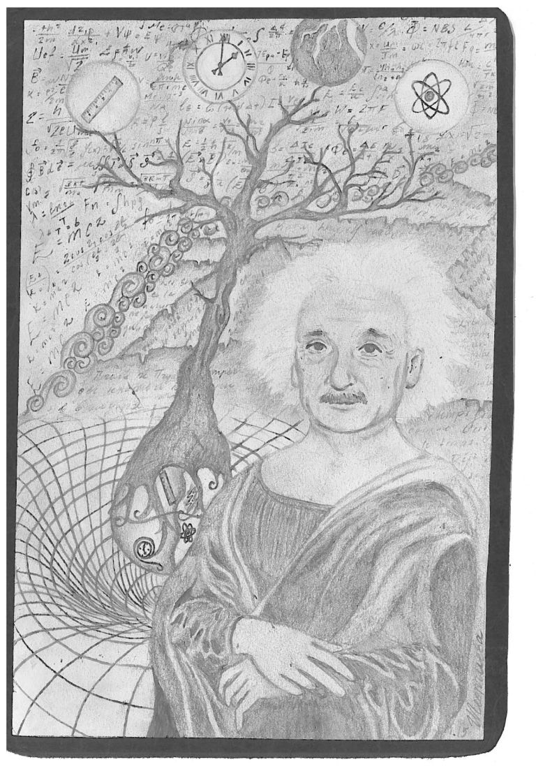 My artwork was produced with led pencils. I find that the countless shades of gray produced by such a medium blend in harmoniously and allow one to create a artwork filled with nuances. Also, the original pictures of Einstein are black and white. When we imagine Einstein, we see him in black and white. Furthermore, black and white represent ancient times. The “old ways” are also represented by the separation of space, time, energy, and matter. This way of depicting these elements refers to the Newtonian view. Newton argued that they were absolutely separate and independent. I wanted to represent both ancient and modern times. Modern times are represented by Einstein himself, the depiction of his theories and his formulas written in the background.