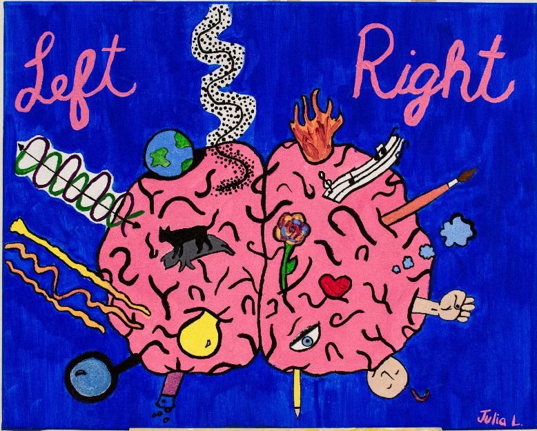The symbols used in the painting reflect the concepts covered in the evolution of science. In the left part we see the beginning of discoveries in physics with the electromagnetic waves and the concept of wave-particle duality. Between the two, Einstein’s general theory of relativity is depicted with the globe and brain moving around its mass. In the middle we see Schrödinger’s cat both dead and alive as a representation of the wave particle duality, where we don’t know the true nature of one thing until we observe it. We also see waves of light, another discovery which evolved the scientific revolution. We then see a light bulb which represents the discovery of electricity as well as the ‘aha’ moment various scientists have encountered during their research and discoveries. Finally the magnifying glass represents the visually analytical nature of the left hemisphere’s perspective.