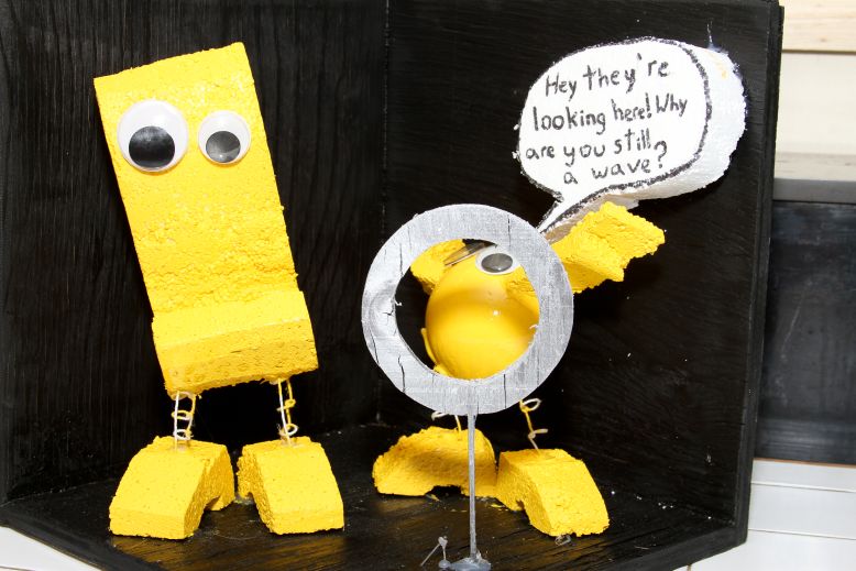 The electron structures crafted in Styrofoam representing a wave and a particle are a parallel to the wave and particle theory. The electrons were given human characteristics to show they have the potential to make decision. According to the double slit experiment, the electrons had the ability to change behaviour when it felt it was being watched. Since the electron can decide when to change their behaviour they must have some kind of intelligence. I gave eyes to my creation because they must have a way to detect the observer. Both electrons in my artwork are not particles because I want to show that quantum has limitless possibilities and does not obey specific rules. I had my electron representing the particle say “Hey they’re looking here. Why are you still a wave?” I chose this quote to show that one of them is not in the expected behaviour.