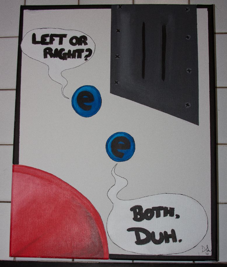 My art work is a painting of the double split experiment with two electrons, one asking “Left or right?” and the other responding with “Both, duh”. My rationale behind the painting is that electrons act differently when fired at a metal plate with slits in it depending on how many slits there are. When there is one slit, the electrons make one line, as if they are acting as particles. When there are two slits the electrons make many lines, as if they are acting like waves. The experiment concluded that electrons act as both waves and particles. When the electrons are fired at two slits, they enter both slits and interfere with themselves. Since one electron is asking “left or right?” it implies that it does not know how to act, as a wave or a particle except it can act as both (just not at the same time). Since it can act as both, they can temporarily act as waves and go through both slits and interfere with itself. Also, when the electrons are observed they go back to acting like particles. This is why I made the electrons talking to each other. It seems as if the electrons know what is going on and they are able to communicate with each other to act together accordingly when they know they are being watched.