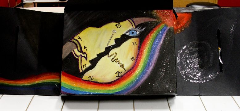 Moreover, we can also see the sun far behind, and the light coming from the sun deviates and goes along the edge of the clock. That represents the relativity of space. The clock is like a heavy star which curves the space. This light represents the visible light with the different colors. And the eye for “observer” also represents the eye of humans; it could only see visible light. In overall, the broken clock with the eye looks like a human’s face. It definitely represents humans. We are always curious and we like to observe, to discover, and to think.