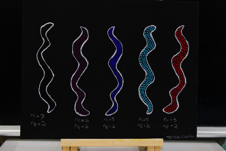 This piece of art tries to make obvious these two obscure phenomena and tries to make simple the complex. The picture shows five different waves, however inside the wave are particles. This represents how the particles and the waves are found within each other in light and how light is not one or the other, but both. Each line is labeled from left to right, ni=7 to nf=2, ni=6 to nf=2, ni=5 to nf=2, ni=4 to nf=2, ni=3 to nf=2. This series of numbers is the initial shell of the electron to the final shell of the electron. Colours are assigned to each of these based on the energy which in turn predict the wavelength. The first line is an ultraviolet line, therefore invisible, the second is purple, the third blue, the fourth turquoise and the last is red. These colours are specific only to hydrogen; therefore if any other element was used, the colours would have been different. These five lines are not the only lines in the emission spectrum for hydrogen, there are in fact at least ten more, however they are all ultraviolet or infrared and invisible to the naked eye which would make a piece of art rather boring.