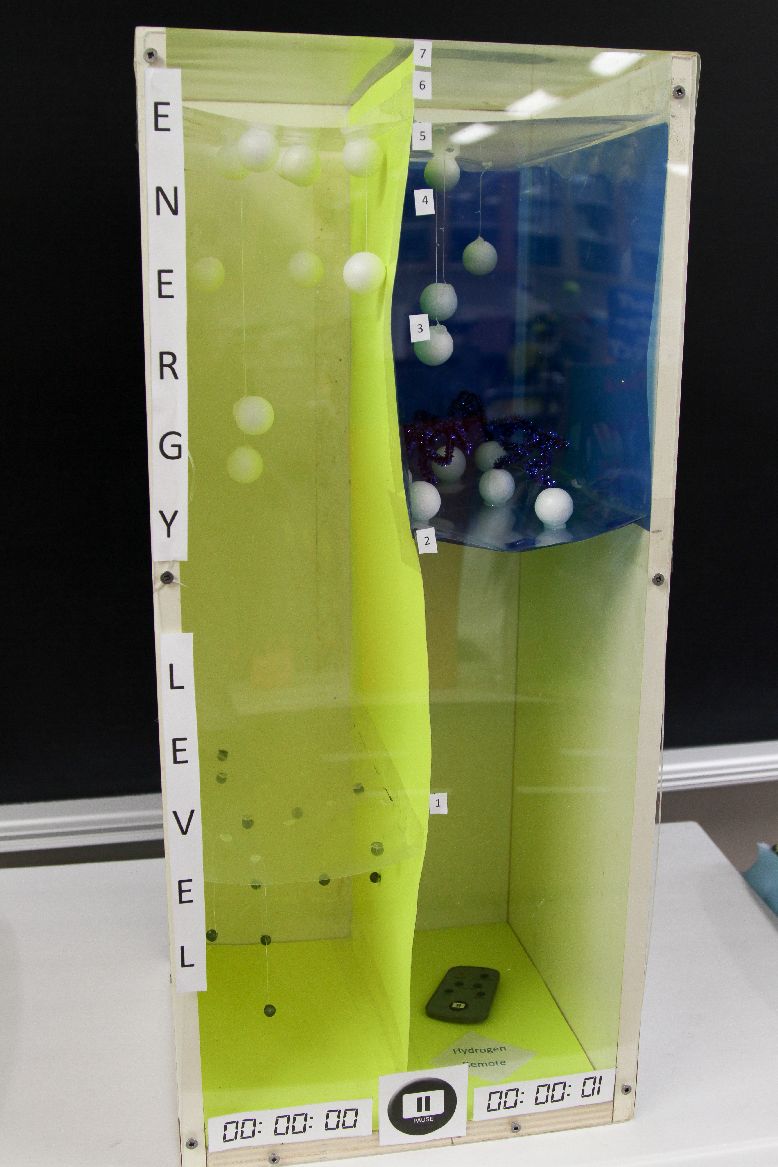 My artwork is a representation of the photoelectric effect as well as to the ideas that come along with the emission spectrum of hydrogen. Firstly, I chose to build a 3-D model of these ideas because I felt that to do so through means of painting or drawing would not be as effective, as it would not show the ideas as clearly. Another principle that was included (but was not necessarily the main theme of the artwork), was the idea of light being composed of photons, but acting as waves at the same time. These quantum ideas were the backbone of my artwork and how they relate will be explained through this rationale.