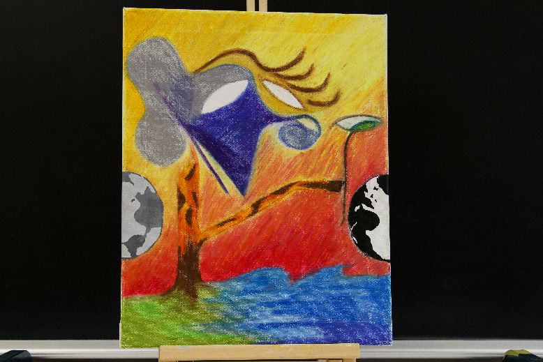 With these themes in mind, my artwork illustrates the idea of an interconnectedness in nature as well as the fluid and unconventional reality of our universe. Primarily, there is no frame around the artwork nor does the artwork have any structured setting illustrating the phenomena of the expanding universe. In the middle of the canvas there is an ambiguous and abstruse figure; a visual integration of human, animal and environmental characteristics to emphasize the unity of existence within the self and the world we live in. For example, the figure has a combination of features; some of elephant, giraffe, and tree and is part of the ocean and earth as well. The face of the figure is abstract and lacks structure illustrating the idea that we cannot tell what we are looking at which is a similar aspect in quantum where electrons jump to all quantum states. Essentially, the entire artwork is a fluid blend of colors and different forms of life demonstrating the idea that nothing can be clearly distinguished within the natural world.