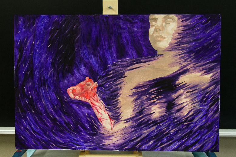 The manner in which I represented the diminishing of my existence was through the use of waves. The waves were formed through the disintegration of my skin and my skin was the lightest color present in the painting. This is symbolic to the wave nature of light and how both the light and my life are represented as being taken into the darkness. The skin as its get further away from the actual sources decreases in size and appears to be more like a particle than a wave, representing the wave-particle duality of light. Schrödinger's equation allowed for the incorporation of both the wave and the particle nature of matter which is one of the ideas that I incorporated from him. Secondly, Schrödinger's cat is the idea in which my whole piece was founded on. The idea of uncertainty is an idea that is associated with the Post-Classical scientific era. I wanted to explore this idea through the contemplation of my own existence. The art piece, like my life, is tangible and in painting I was in control of how I viewed my own existence. Magritte used the notion of representation, an idea that I drew up. I painted an image of myself therefore it is not me but merely a representation of me. However, what does it mean to be me... to be alive? What does it mean to exist when there is a possibility of a dual universe. The duality of my existence was represented through my heart. A functional human heart is what differentiates someone who is dead from one who is alive. In the painting I am holding my heart and although it is removed from my chest, it is still connected to my body through veins representing being dead and alive at the same time. I am dead because my heart is exterior to my body and I am alive because it is still connected and functioning.