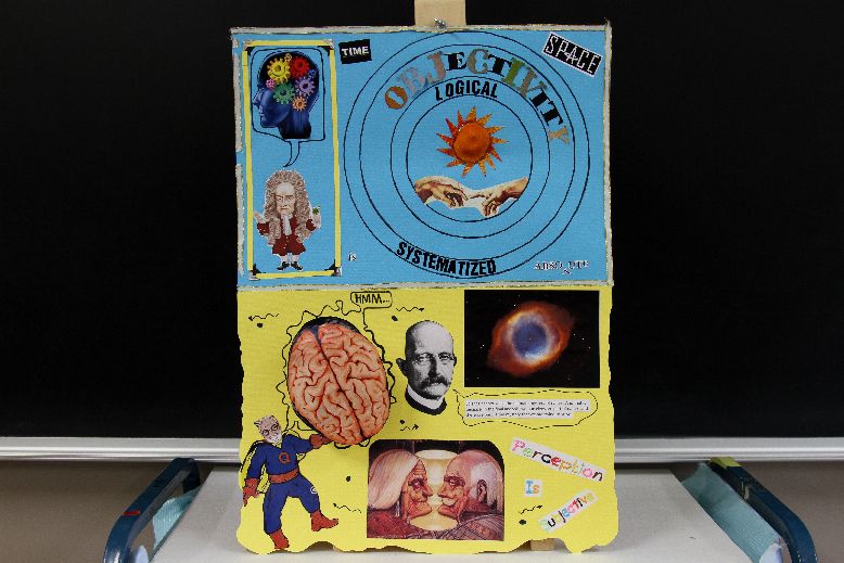 The first and foremost goal of this particular piece is to project the differences and contrasting views in the Classical Newtonian world of science and Quantum scientific view. The Newtonian world of science strived toward the systematization of the natural world. As expressed in the piece, Newton would have referred to the brain as a much more rationally-assembled, whole, and somewhat divine entity. In fact, Newton believed he was one of the few individual minds on the earth meant to decode and demystify the Bible in order to obtain its true connection to nature. This exemplifies a view of science that still relates to some sense of divinity; this connection is expressed with the cut-out of the Creation of Adam and systematized picture of the "geared-brain". In addition, various words were incorporated in the piece that express some of what science was believed to be at the time: a "Logical" and "Rational" way of demystifying nature's secrets that was most importantly "objective". In contrast, the views of Quantum science provide a much more uncertain and complex look at nature. One idea which is entertained in Quantum theory is this notion of subjectivity and how objectivity is problematic. As Max Plank, the father of Quantum, said, "Science cannot solve the ultimate mystery of nature. And that is because, in the last analysis, we ourselves are a part of the mystery that we are trying to solve". Two ways the piece exemplifies this notion is with the eye-shaped galaxy picture and the optical illusion of an old couple. In the case of the eye-shaped galaxy, the eye is part of the universe; showing us that we are bound to our own self and subjectivity. However, in addition to this, it shows that the very body one is confined to is essentially part of the natural world and thus can only see a part of the universe and not the whole. This connects to the depiction of Dr. Quantum and his questioning of the brain's ability to fully comprehend the world. The brain, being our (often) rational and logical thought-processor, is very complex. In fact, even neuropsychologists are uncertain of how many of the brains functions work. Therefore, even if our brain was somehow a separate entity from the universe, we would still not be able to fully understand the world. This is because we do not even fully understand the very brain we would use to try and understand the universe with.