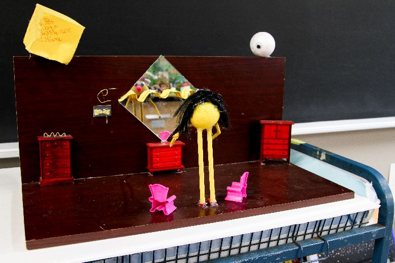 In my artwork, I chose 3 different ways to represent an electron: A yellow sphere that looks like an actual being with hands, legs and eyes; the e- (1960-2011) on the perpendicular wall; and the yellow waves ( located on the mirror and on the left hand drawer). Some people might think that it would be wrong to choose these ways to represent a subatomic particle. However, it's not wrong because that's my perception of what an electron looks like. My entire artwork doesn't present what an actual electron looks like in real life and I clearly state that with the disclaimer on the top left hand corner: "This not a particle nor a wave". At this point, we might ask ourselves why there is a representation of a wave facing the standing human-like yellow representation of an electron. Common sense dictates that a mirror is supposed to project an image of what is in front of it. However, in my artwork, the reflection of the yellow Sphere is a yellow wave, to represent the particle-wave duality of matter. This is mainly caused by the observer (represented by the eyeball on the top right corner) that changes the outcome of the mirror's reflection. Briefly, my artwork is a mere representation of the particle-wave duality of matter and the fact that an observer can change the outcome of an experiment. Even though my artwork doesn't represent scientific properties of subatomic particles, I think it would help people understand the weird world of Quantum.