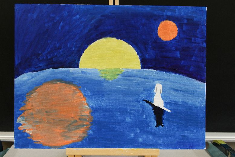 In my painting, I wanted to represent the moon illusion. The moon illusion is an illusion that the moon seems bigger when is closer to the horizon. However, the moon isn't actually bigger when it is closer to the horizon. Actually, our brain created this illusion. Until now, we only have hypothesis which try to explain it, but the real answer is still unknown. In the painting, the moon is way bigger than its reflection on the water because I want to represent the reflection of the water as reality, and above the horizontal as what we normally see.