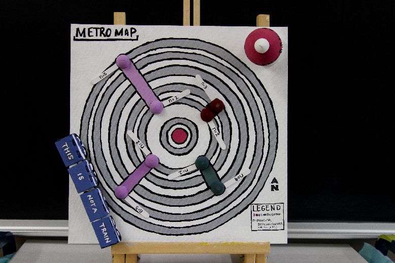 I added a train on the map that it is made out of a sponge and painted with acrylic paint. On the roof of the train, it is said, "This is not a train". I wrote that because I was inspired of the work of René Magritte. For example, he painted an apple that was said, "This is not an apple". Magritte is trying to show in his painting that the apple is not an apple, but a representation of it. Therefore, the train that I made is not a train, but a representation of a train.