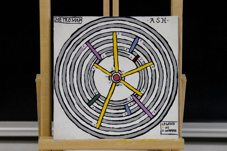 The name of the metro is called A.S.H., which stands for the Atomic Spectrum of Hydrogen. The map that I drew is like the Bohr model, which was developed by the Danish physicist Neils Bohr. His model shows that electrons travel around the nucleus in circular orbits. So, each orbit that is painted in grey, in both of the canvases, represents an energy level. Or, it can also be called stationary state, meaning that each orbit is fixed or quantized. In addition, I painted a red circle in the middle to indicate a hydrogen atom.