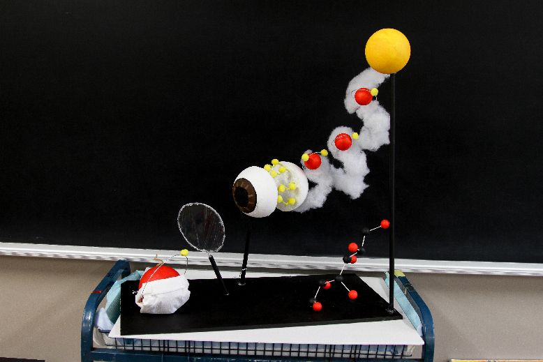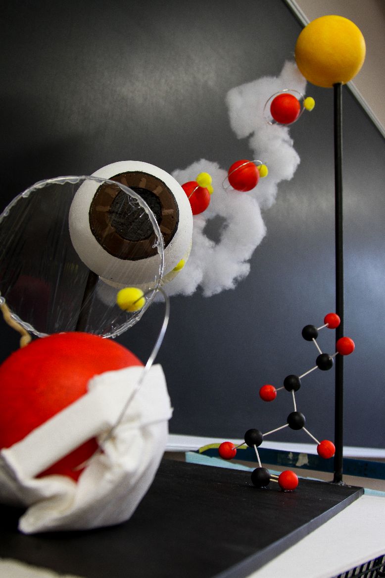 If the idea of molecular shape is mentioned, than the idea that chemical bonds form when electrons pair is intrinsic to the project. It is because of the desire for an atom to complete it outermost shell that atoms form both ionic and covalent bonds and are able to form the molecular shapes that are so crucial. This idea was demonstrated by the yellow pom-poms connecting both sides of the eye in my project, showing that is thanks to these bonds that we may have life as we know it.