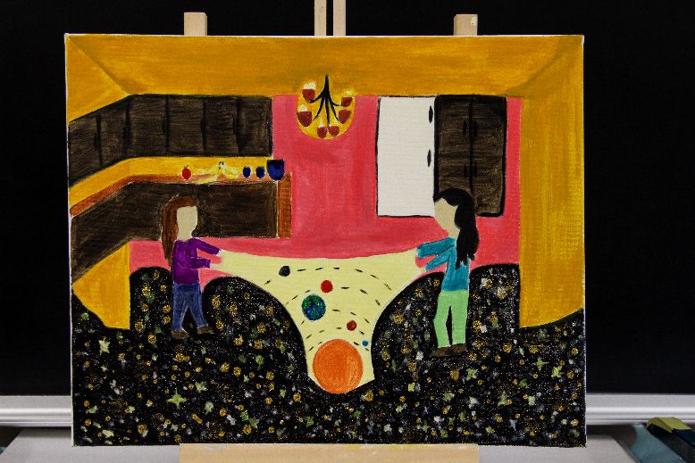 One scene, in "Einstein and Eddignton" inspired my entire artwork. Arthur Eddington and three other people hold the edges of a tablecloth. Eddignton places a loaf of bread at the center and asks the others what they believe would occur if he placed a tangerine on the tablecloth as well. It was astonishing to see that the tangerine rotated around the loaf of bread. Eddington used the tablecloth to represent what occurs in space. The tangerine rotated around the bread, just as the planets rotate around the sun in space. This aspect also demonstrated the gravitational pull. Gravitational pull is related to the concept of why objects fall to the ground when we drop them. The sun's gravity pulls the planets; it exerts the strongest gravitational pull. This idea truly amazed me, therefore, I decided to replicate this image, yet instead of using food, I would depict the planets. Originally, I wanted to paint four people holding the tablecloth, yet the image would not look three-dimensional. Instead, I depicted two girls holding both edges of each side of the tablecloth. They are standing in a kitchen, just as Eddignton, yet there is one major difference. Instead of placing them onto a wooden floor, I decided to make the floor space. This is the most important aspect of my entire painting. It shows that one can represent the planets gravitational pull in space, by using a tablecloth. It also shows that the representation of the planets on the tablecloth with elliptical orbits, adequately defines what occurs in space. Therefore, since the image is exact, it is almost as though they are in space, hence the chosen floor.
