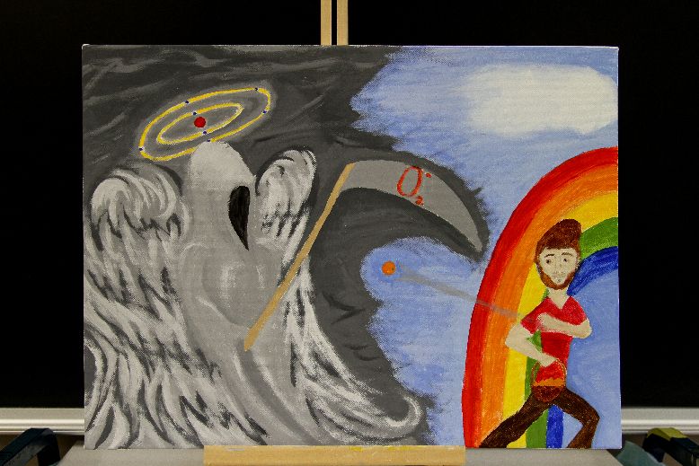 My painting is divided into two parts due to the visual effect of the colors. One half of the image is painted in darker and greyish colors while the other half is brighter and painted with a verity of colors. The darker side of the painting represents the evil side of oxygen that plays an important role in ROS. On the other hand, the brighter and colourful part of the painting illustrates the good side of oxygen which is quintessential in our daily life.