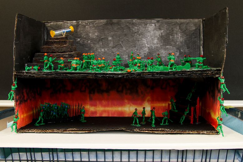 Oxygen is a vital element that can be highly reactive when it undergoes chemical reactions and thus produces free radicals. These harmful species partake in chain reactions that can lead to cellular damage. In my art work, these free radicals are represented as unstable soldiers who initiated an attack in the human body. They are differentiated from the other soldiers by its red army gear. This color represents evil, death, power and unstableness. Another aspect that is relevant for the free radicals is the staircase and the soldiers climbing the sides of the base. The staircase represents the metabolic process in the human body, this of which free radicals are formed as by-products. Also, the soldiers climbing the base symbolize the external sources that generate free radicals such as sun exposure, smoking and polluted air.