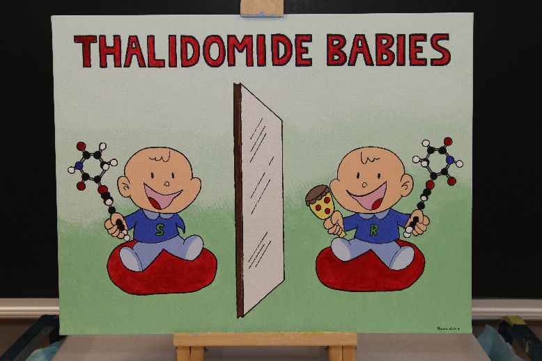 The pharmaceutical industry is constantly working on methods and ways to enhance their drug's efficacy, as well as its safety for the consumer. The hurdle that they are constantly being slowed by is the chirality in a majority of the drugs being produced. Chirality is the asymmetry or handedness of a drug. The most common way chirality can arise is through an asymmetric carbon. A carbon atom is said to be chiral when it is attached to four different atoms or groups. This being the case, there can be two enantiomers (right and left handed) produced that have similar structures but differ in spatial arrangement. In other words, the two enantiomers are mirror images of each other and are not superimposable, similar to our hands. Therefore, since the body is able to identify between enantiomers, it is crucial for the pharmaceutical companies to separate them, making a chirally pure sample of the drugs. In the case of this painting, the thalidomide chiral drug was produced in order to help pregnant women with morning sickness. However, at the time of its production, the scientific community had not yet learned about chirality and its handedness. Because of this lack of knowledge, many babies, whose mothers had consumed the thalidomide drug during pregnancy, were born with malformations. In the painting there is a mirror in the center standing vertically, and there are two babies to either side of it. Each baby is smiling and enjoying itself as babies normally do. They are holding, what look to be, identical models of the thalidomide drug. However, being that the thalidomide drug contains a single chiral carbon that is spatially positioned to produce non-superimposable mirror images, one is actually holding the 'S' enantiomer while the other is holding the 'R' enantiomer. The babies holding the 'S' and 'R' enantiomers have an 'S' or 'R' on their shirts respectively. Consequently, the baby holding the 'S' enantiomer represents the baby born to a mother who took thalidomide during her pregnancy and was affected by that enantiomer, causing her child to be born without a left arm. On the other hand, the baby holding the 'R' enantiomer represents the baby born to a mother who also took the thalidomide drug during her pregnancy, but instead either took it at a different time during the pregnancy or was simply not affected by the 'S' enantiomer, and therefore gave birth to a normally healthy looking child. The header on the painting clearly states "Thalidomide Babies" to help the observer to understand what the painting is about. The babies on both sides of the mirror, as well as the cushions they are sitting on, are drawn in such a way so as to give off the mirror effect. In other words, one side is painted as the mirror image of the other, with the exception of the missing arm. The colors in the painting, were not chosen for a specific reason other than to make the painting visually appealing, except in the case of the thalidomide models painted in the babies' hands, where the colors used follow the convention of colors given to the elements.
