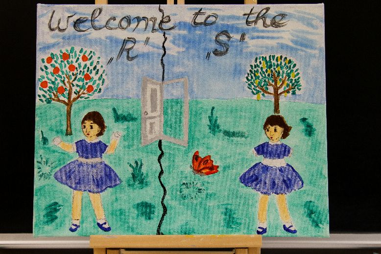 The artwork I did is a painting where I tried to illustrate chirality under different forms. The painting represents two parallels words each referring to either the R- or the S- configuration of molecules (they are enantiomers which makes them mirror images of each other). The door in the middle of the canvas is showed in order to connect both worlds, because there is no R without S the same way as non-chiral compounds don't have enantiomers. Afterwards, on both sides there is a little girl where one is normal and the other one has shorter hands. This character refers to the thalidomide incident that occurred in the 60's where a lot of babies had abnormalities due to an anti-sickness drug. Afterwards, the threes at the back refer to the compound of limonene, where it either smells as a lemon or an orange depending on if it is R or S. For this reason, one three has lemons and on the other side it has oranges; both referring to limonene's smell. To continue, the little butterfly symbolizes the L-amino acids that are present on Earth. Humans are all composed off L-amino acids, which means that if they move to another world with only D-amino acids they would not survive (D/L configuration is the same as R/S) because the digestion will be very hard. Returning to the painting once again, the butterfly refers to the same situation; it is compatible with the amino acids of one world, but if it moves to the other side, it dies. Finally each world is identified at the top as R or S. All the elements that are in the R half correspond as the R isomers of the elements, as in the S half everything that is represented there corresponds to the S isomers.