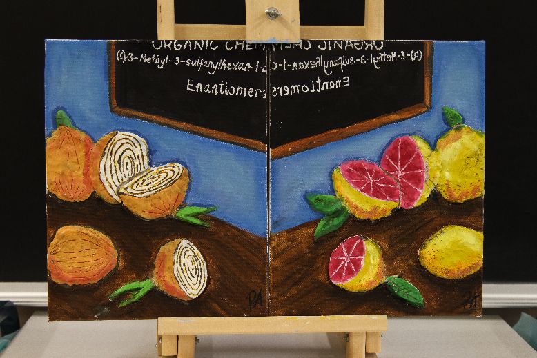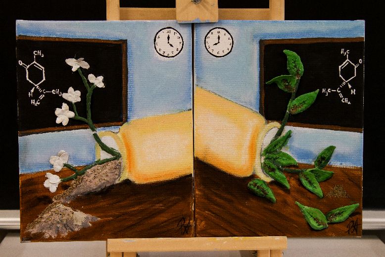 This artwork portrays how enantiomers differ in smell. On the first two images, I illustrated spearmint and caraway seeds. Although spearmint and caraway may not look like they're physically related, their chemical structure is very similar to each other. In fact, the only difference in their chemical structure is that one is the mirror image of the other. These are known as enantiomers. There might not be very scientific concepts on the paintings, but look closely at the chemical structures drawn on the blackboard. This simple structure is what causes the specific smells of spearmint and caraway. They were purposely drawn as if one of them was facing a mirror, since it is the enantiomer of Carvone that has the odour of caraway. The main idea in these paintings is to draw them opposite of each other, in other words, they have to look like one is a mirror image of the other. This is why the spearmint and the caraway seeds are in the exact same yellow jar, and the table is made of exactly the same material and the clocks are both red. The only difference that should be visible is what the jar contains. For the next two canvases, I illustrated onions and grapefruits. Just like spearmint and caraway seeds, they are not physically similar, but their smells are both based on the same chemical compound: 3-Methyl-3-sulfanylhexan-1-ol. The enantiomers of this compound which are (S)-3-Methyl-3-sulfanylhexan-1-ol and (R)- 3-Methyl-3-sulfanylhexan-1-ol differ in the smells they project: one has the smell of onions, and the other has the smell of grapefruits. You can see on the painted blackboard the UPAC names of the chemical compounds, where on the first painting is (S)-3-Methyl-3-sulfanylhexan-1-ol, and (R)-3-Methyl-3-sulfanylhexan-1-ol on the other, which is written backwards (since it is supposedly the mirror image). To really visualize the organic chemistry in this artwork, you have to look at all four paintings together where you can see the chemical structure and UPAC names of the compounds, and also the distinctive odours each of the enantiomers give. The choice of color was very important to bring out the essential parts of the artwork. I chose to use very dull colours for the background such as blue, gray and brown so that the bright colours "pop out". The use of the blackboard really helped bring attention to the chemical structure, and the name of the compounds. I then thought that since white on black were colors that are very noticeable, I had to use even brighter colors to bring most of the attention towards the spearmint, caraway, onions and grapefruits. I then thought of using clay to give a three dimensional effect, which would surely attract the most attention. Over the clay, I tried using different shades of bright and vivid colours to give a better effect. Finally, to make it easier to understand the topic that is related to my artwork, I added real dried mint leaves and real caraway seeds over the clay to really express the different odours of the enantiomers. Organic Chemistry has many interesting concepts that we can relate with our everyday lives. Just like the topic of this artwork which is how a simple compound that is basically a mirror image of another can express a completely different smell. Without organic chemistry, no one will be able to find any relationship between an onion and a grapefruit, or spearmint and caraway, when in fact, they share almost the same compounds.
