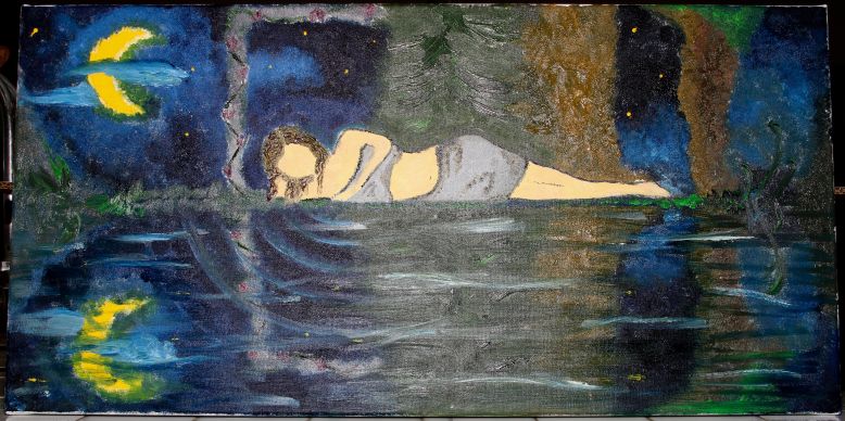 My artwork consists of a 15” x 30” painting of a night time scene being reflected. Everything in the scene is reflected except for the faceless girl lying on her side.