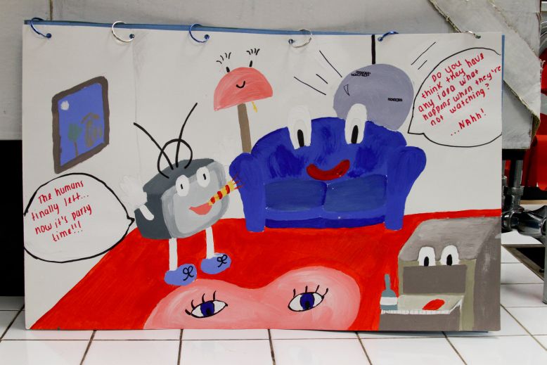 The art project I have created is a painting of cartoons which depicts an aspect of the Quantum theory. The project consists of 3 cardboards which have images on them. The first one is a cartoon of a simple room; however the furniture in the room has eyes and mouths. They are talking to eachother and the television says “The humans finally left…now it’s party time!” This shows that once we leave a room, anything could be happening. We are not there to observe therefore there is no possible way of knowing the truth. Also, the couch says “Do you think they have any idea what goes on when they’re not watching? …Nah!” This is referring to us, the humans. It shows how the furniture could only be fooling us when we’re in the room. This idea is similar to the cartoon about the cows which stand on two legs but when a car passes by, they all go back on four legs. This is the message I am trying to convey through the artwork, and the following two cardboards have the same message. One of them is an eye open and inside the eye we see the world and it reads “The way we see the world” and the next cardboard is the world and in the world there is a closed eye which reads “isn’t always the way the world sees us…” Basically, what I’m trying to say through these drawings is that we have a certain vision of the world which we do not question, however there is a possibility that the world around us isn’t really what it seems to be. The furniture seems to be lifeless, however we never know what happens when we are not observing. Also, the eye has the world in it, which is a symbol for our vision of the world, but the other eye which is closed and encircled by the earth, suggests that maybe it is the world that is watching us, and not vice-versa.