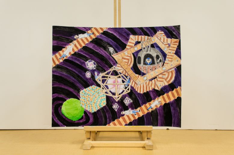 It is this exploration of the evolution of the complexity of our perception of the atom that I have focused on in my artwork. I was inspired by the artwork of M.C. Escher, the Dutch artist and creator of impossible graphic constructions. These impossible structures contained everyday objects like buildings, waterfalls and stairs and drew them in such a way that could never exist in this world, such as stairs that seem to descend in circles, never-ending. His works allow the observer to ponder on how the work was done, how could something so foreign to reality be able to be created on paper. I then saw a link between Escher’s works and the modern model of the atom. I thought that by drawing an atom that looks like an abstract little city that it could convey the almost paradoxical mechanisms of the atom, how the model takes elements we thought we knew so well such as electrons and orbitals, and define them in ways that seem almost inconceivable. Preceding the largest atom are simpler representations of the atom; one emphasizing the importance of orbital shapes, the previous illustrating of the idea that atoms bond, and the first one being a solid sphere, the original postulation that matter is made of spheres; the atom. The entire illustration was also aimed to portray some of Atkins’ big ideas in chemistry. Of course the idea that all matter is made up of atoms is predominantly shown with the variant representations of the structure. Next, the second diagram displaying the ideology that atoms can bond together exhibits the point that when electrons pair, atoms bond together. Elements display periodicity can be found in the representation that takes into account orbital shape have different structures to the left and to the right of the main one, displaying that each column of elements on the periodic table share certain characteristics. This representation also has little people with protractors and rulers measuring the shape of the atom’s orbitals, which explains the idea that atom’s have specific orbital shapes at different angles in order to minimize the repulsion between electrons (as stated in the valence shell electron pair repulsion theorem). The orbital shape of the central atom of a molecule will determine the shape of the molecule itself; a crucial characteristic of molecules. In the abstract atom, we see electrical wires, and chimneys in the little “city”, which represents conservation of energy; what energy an electron absorbs, it is eventually is released.