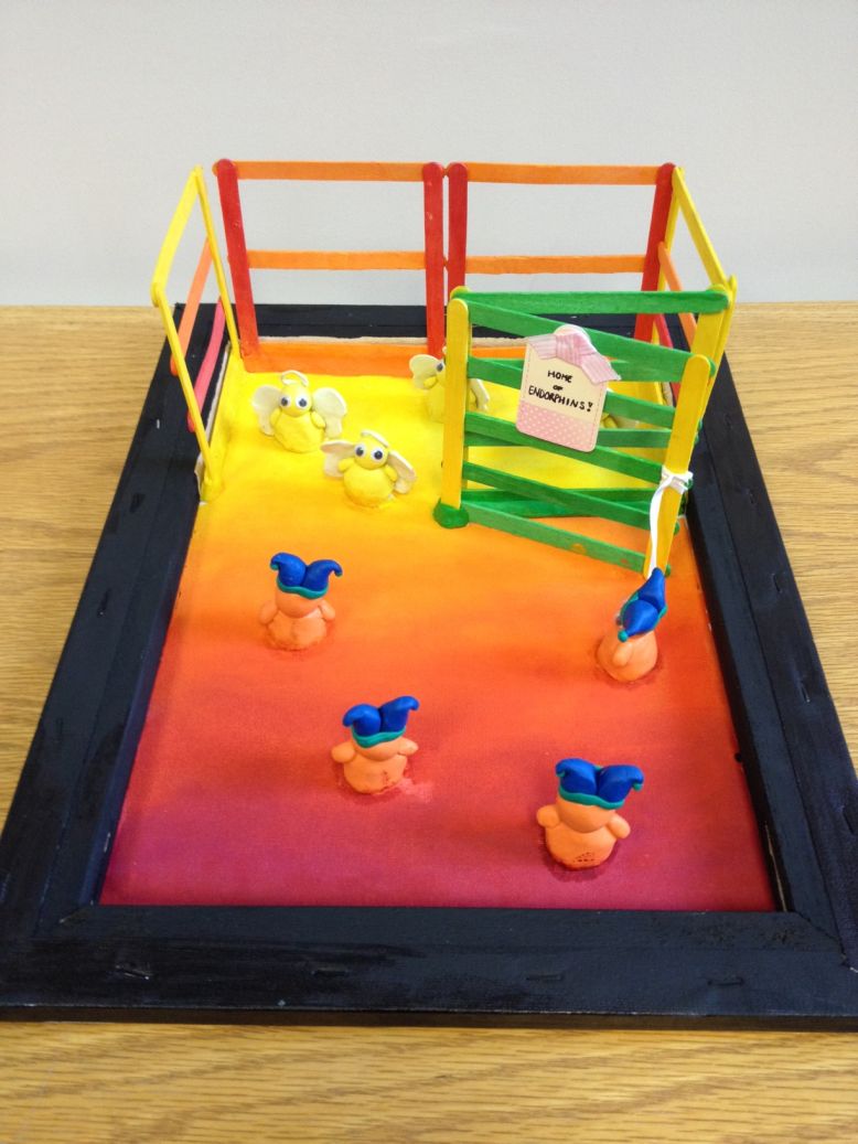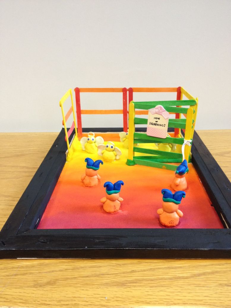 Since jesters are entertainers that make people laugh, I decided to represent the laughing gas as jesters, and since angels always watch over us, I decided to represent the endorphins that protect our body from feeling pain as angels. The red painting represents the blood in which the the N2O molecules use to travel up to the brain. The yellow painting represents the brain in which the endorphins reside in. Since N2O releases endorphins, I showed the jesters opening the door of the endorphins’ home and inviting them to come out.