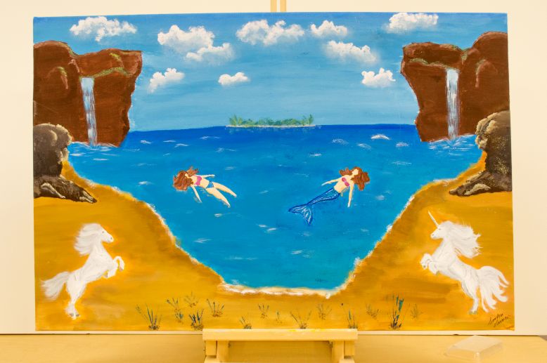 In conclusion, my painting endeavours to symbolize the homochirality of amino acids, that is, the fact that on Earth, amino acids are almost exclusively levorotatory. To do so, chirality is first expressed in my painting in the background which is separated in two, both halves being non-superposable mirror images of each other. Then, the levorotatory aspect of amino acids synthesizing proteins on Earth is seen on the left-hand side of the painting which depicts a landscape as well as the girl swimming and the horse; none of these elements are foreign on Earth. The right-hand side, however, features elements such as the mermaid and the unicorn which are in fact alien to Earth. This side suggests the possibility of dextrorotatory amino acids existing in another world. Overall, this fantastic side of my painting is a symbol of what is yet to discover outside our planet concerning amino acids and the synthesis of proteins.