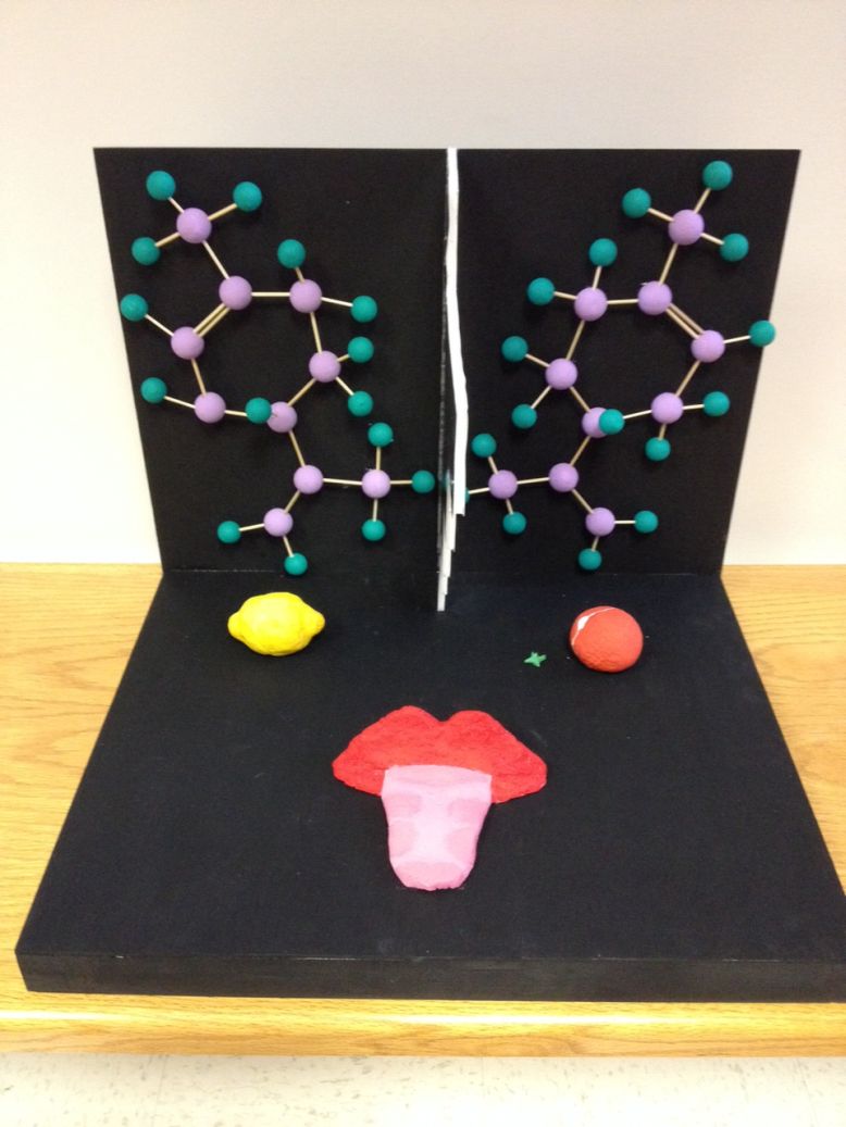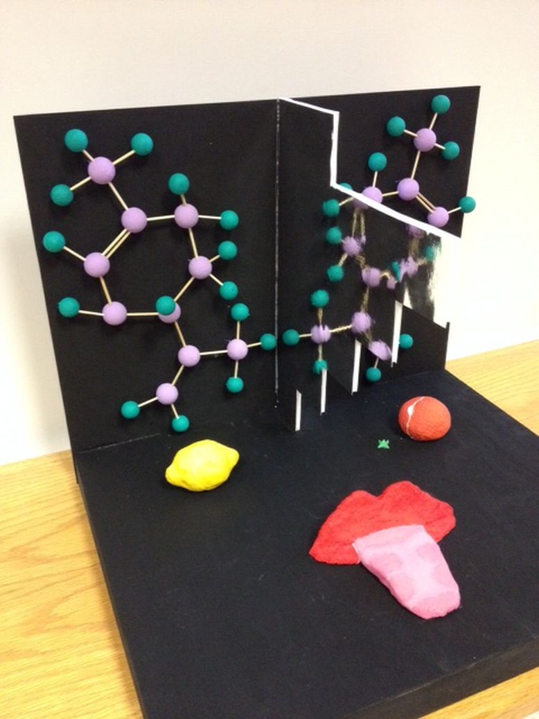 My artwork consisted of displaying both tastes of limonene when it comes in contact with the taste receptors on the tongue. Through my artwork, I was able to display five of Atkins’s big ideas in Chemistry. The simplest and most basic idea is that matter is made up of atoms. This can be clearly seen in my artwork by the two molecular structures of Limonene. Since Limonene has a molecular structure of C10H16, I was capable of clearly representing how the molecule was made up of atoms. The two structures also display how chemical bonds form when electrons pair. In Limonene, all ten of the carbon atoms follow the octet rule, where eight electrons are found on the valence shell. Another one of Atkins’s big ideas is displaying how molecular shape is a crucial feature in chemistry. Although both molecules are Limonene, when the structure becomes a mirror opposite, there is an effect on the sensory receptors, changing the flavour between orange and lemon. Therefore, the slight changes in the structure of the molecule have a large impact on its characteristics, which were displayed by a mirror that was placed down the middle of my artwork. The two Limonene structures are non-superposable, meaning that one cannot be placed on top of another in hopes of seeing them as identical. These three of Atkins’s big ideas are well portrayed through the two molecular structures of Limonene that I created in my artwork.