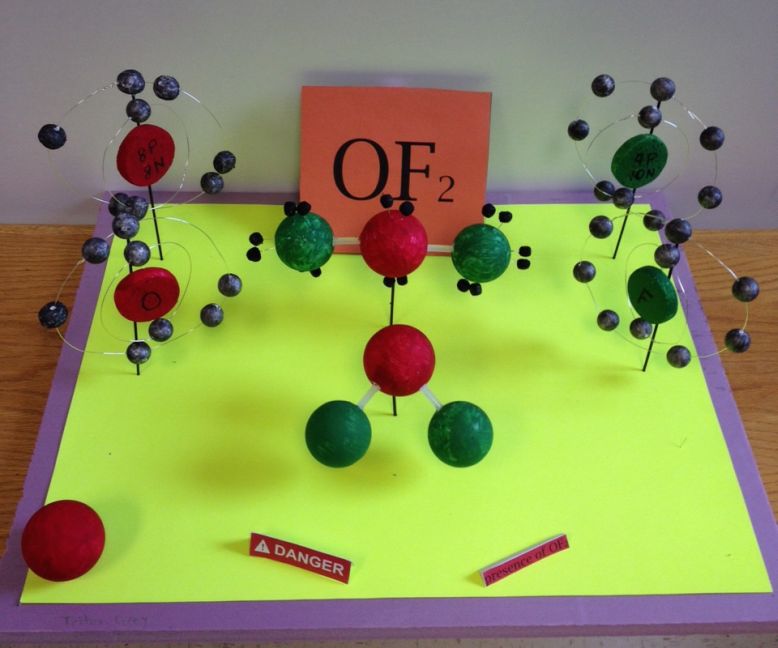 My art project was based on OF2. I made several structures of oxygen and fluorine. I used green color to correspond to fluorine and red for oxygen. I chose these colors because they are the colors that oxygen and fluorine are used in molecular models. I put small signs in front of all the structures that say “warning” and “presence of OF2” because it is such a dangerous compound and I wanted to demonstrate this fact with these signs.