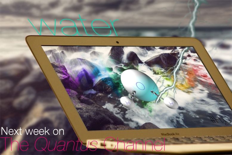 Finally, water and quantum find harmony in my creation. Water or any matter, in fact, emits waves. De Broglie argued about this with his formula. This is represented by the visible range of colours seen on the computer screen. Notice how we cannot see any other colours outside the display. This refers to the presence of imperceptible waves in real life, the computer screen acts as a magnifier. The display is playing with light to show us colours because it uses a polarizer known for blocking certain waves. Therefore, the screen can improve the colours (and acts as a magnifier to show the structure of water). It is related to quantum (waves and particles). The addition of a lightning hints at a bond breaking (between oxygen and hydrogen). A playful reference to the energy transferred by light to break these strong bonds.