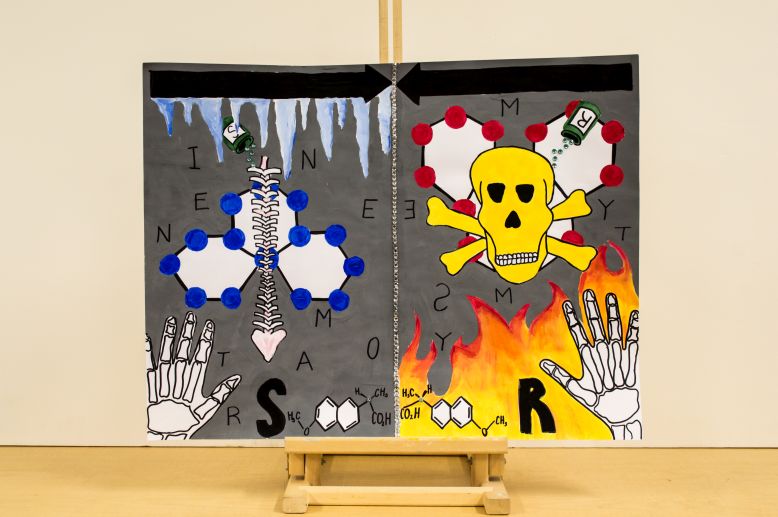 The fact that Naproxen is actually a chiral drug is what got our attention at first. When Naproxen is used as Aleve, it is the S enantiomer of the drug. This enantiomer is mainly used to treat arthritis, hence relieve pain in the joints. To represent the soothing effect of S-Naproxen, we surrounded the spine in our artwork with a soothing color such as blue, which also explains the icicles on top of it. Having learnt that an enantiomer is a non-superimposable mirror image of a compound, we illustrated it in our art project. The line in the middle of the artwork represents a mirror. On the left side there’s the S-Naproxen molecule whereas on the right, its mirror image is drawn, which gives the R-Naproxen. Also, both left and right hands can be considered as enantiomers because they are also non-superimposable mirror images of themselves. In addition, the presence of letters shows that not everything can be enantiomers; some compounds such as meso compounds don’t have enantiomers because there’s an axe of symmetry. On the other hand, the R enantiomer doesn’t relieve anything. It actually causes liver poisoning, which explains the flames and the red color on the right side of the artwork. All the violent colors such as red, yellow and orange is representative of death, poisoning, or unstoppable pain.