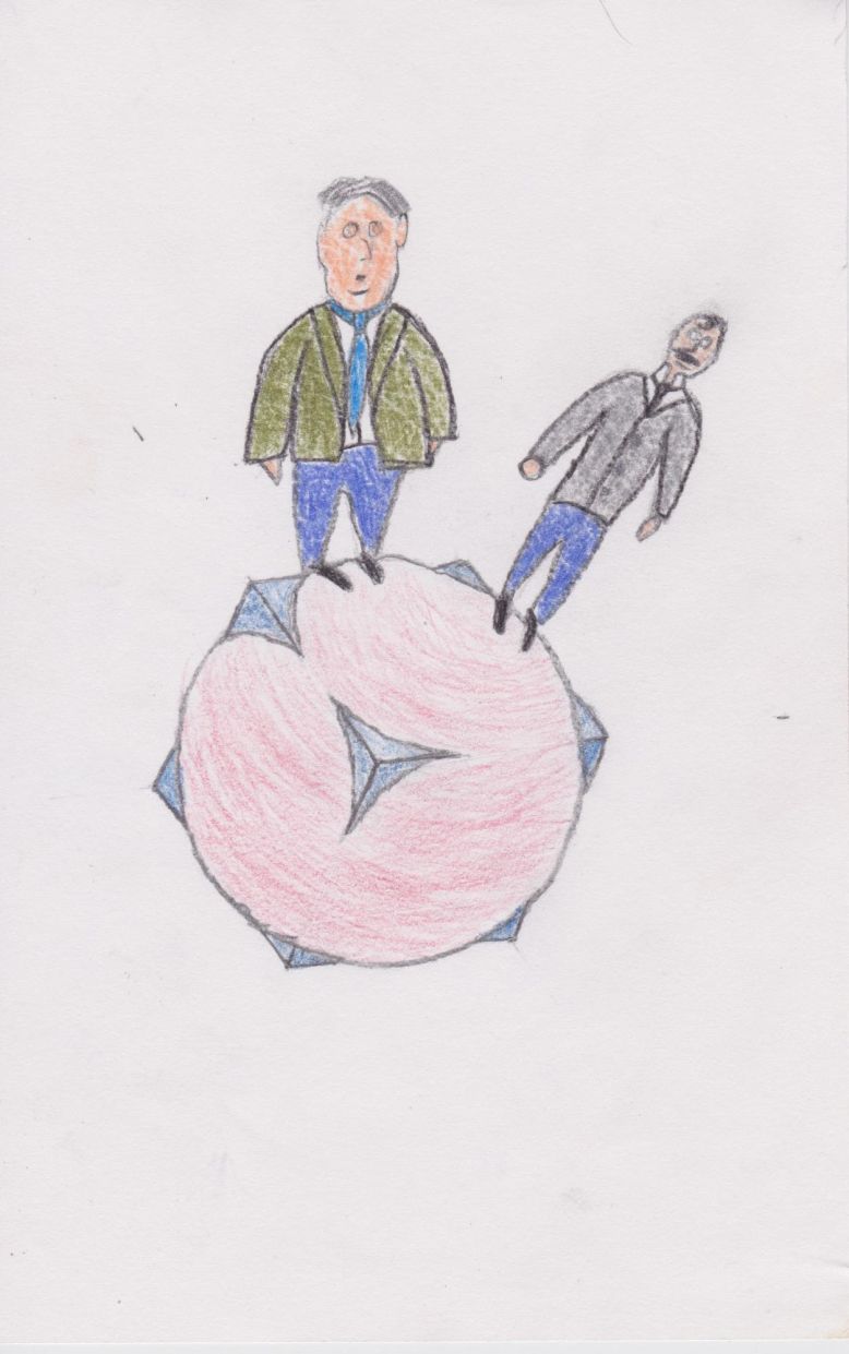 The boy now travels to Rutherford and Bohr’s asteroid, which looks like a cube inside a sphere (as way to try to reconcile the two aspects of their theories). Their model partly obeys Newtonian physics and makes new suppositions that obey quantum mechanics. The electrons are moving around the atom like planets around a solar system, but they also disappear from one energy level and reappear in another. In Bohr and Rutherford’s model, electrons are said to be quantized because they do not follow conventional trajectories, they simply disappear from point A and reappear in point B. Bohr and Rutherford’s asteroid follows these properties; it has both a sphere whose tangent lines are slowly changing from one to another and a cube that has no transition between tangents, the tangents of the cube dramatically change, like the position of an electron. Bohr and Rutherford show the protagonist their model and the Little Prince complains that it is unstable, so he moves to another asteroid.